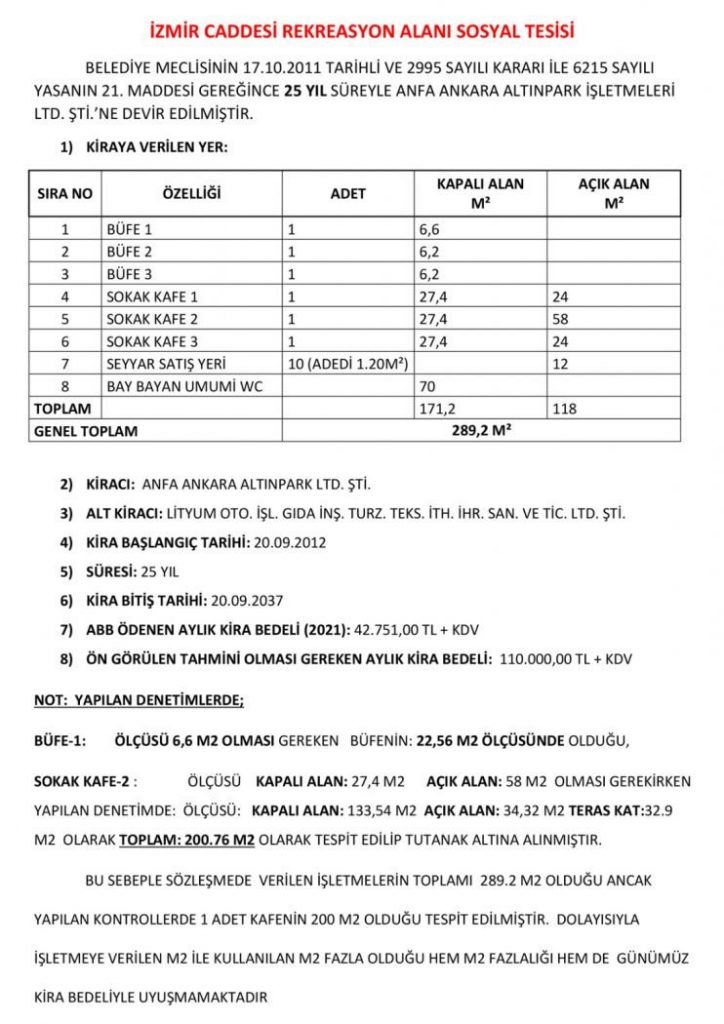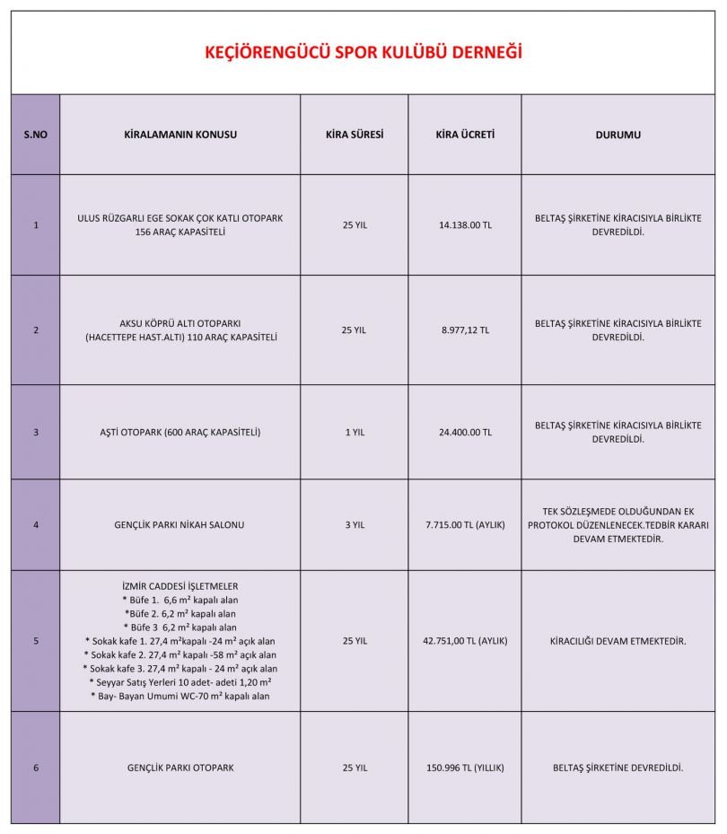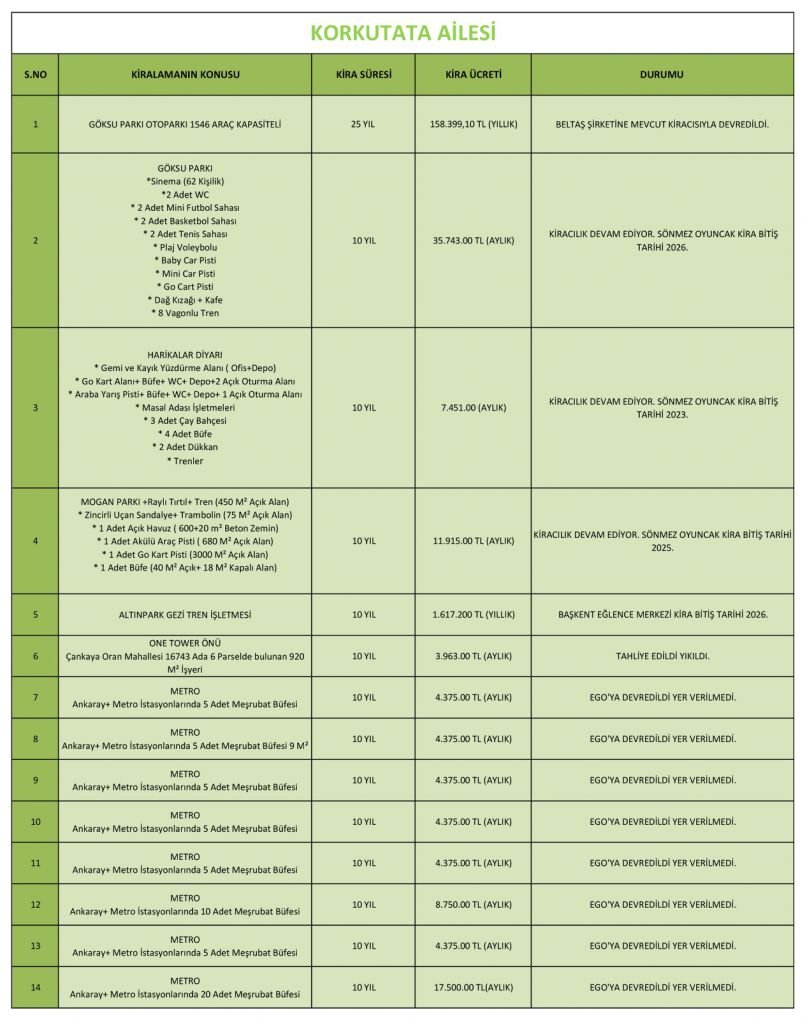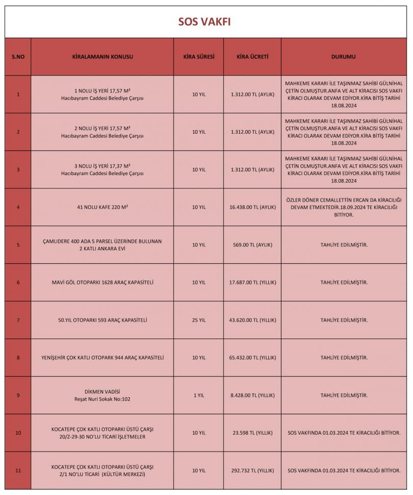 Ankara Büyükşehir Belediyesi (ABB), eski Ankara Büyükşehir Belediyesi Başkanı Melih Gökçek’in belediyeye ait ve teslim etmediği taşınmazların listesini yayınladı. Yapılan açıklamada, “Gökçek’ten eşinin yönetici olduğu vakfa, malum spor kulübü derneklerine ve dostu olduğu bilinen kişilere ücretsiz tahsis edilen veya kiralanan yerleri de iade etmesini bekliyoruz” denildi.