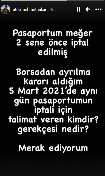 Atilla, Instagram hesabından yaptığı paylaşımda "Pasaportum meğer 2 sene önce iptal edilmiş. Borsadan ayrılma kararı aldığım 5 Mart 2021'de aynı gün pasaportumun iptal için kararı veren kimdir? Gerekçesi nedir?" ifadelerini kullandı.