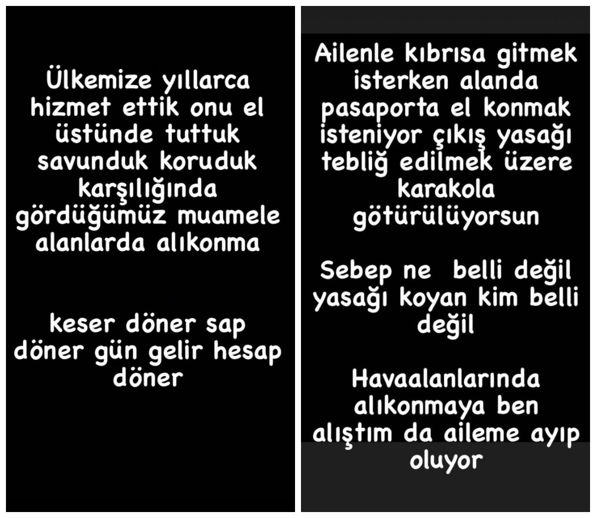 Atilla, bugün instagram hesabından yaptığı paylaşımda, “Ailenle Kıbrıs’a gitmek isterken alanda pasaporta el konmak isteniyor, çıkış yasağı tebliğ edilmek üzere karakola götürülüyorsun” dedi.