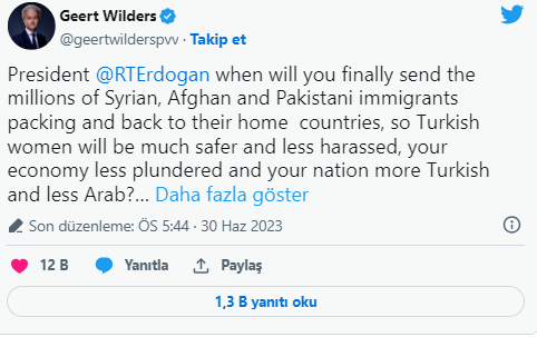 Wilders paylaşımında "Cumhurbaşkanı @RTErdoganNe zaman milyonlarca Suriyeli, Afgan ve Pakistanlı göçmeni toplayıp kendi ülkelerine göndereceksiniz, böylece Türk kadınları çok daha güvenli ve daha az taciz edilecek, ekonominiz daha az yağmalanacak ve ulusunuz daha fazla Türk ve daha az Arap olacak?" dedi.