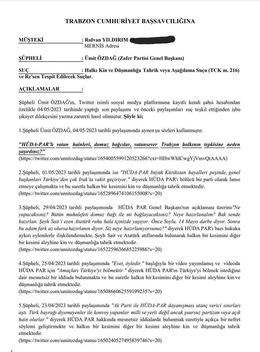 “Sosyal medya hesabından partimize karşı halkı kin ve düşmanlığa sevk edici paylaşımlar yapan ve gerçeğe aykırı paylaşımlarını sürdüren, son olarak da Trabzon'da stand çalışmaları yapan üyelerimize karşı provokatörleri kışkırtan Ümit Özdağ hakkında suç duyurusunda bulunulmuştur.”
