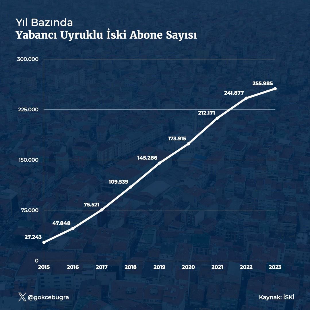 Gökçe X hesabından yaptığı açıklamada İSKİ'ye kayıtlı yabancı uyruklu abone sayısının 2,5 milyon olduğunu belirtti. Gökçe paylaşımında şunları kaydetti: