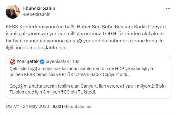 "KESK Konfederasyonu’na bağlı Haber Sen Şube Başkanı Sadık Canyurt isimli çalışanımızın yerli ve millî gururumuz TOGG üzerinden akıl almaz bir fiyat manipülasyonuna giriştiği yönündeki haberler üzerine konu ile ilgili inceleme başlatılmıştır."
