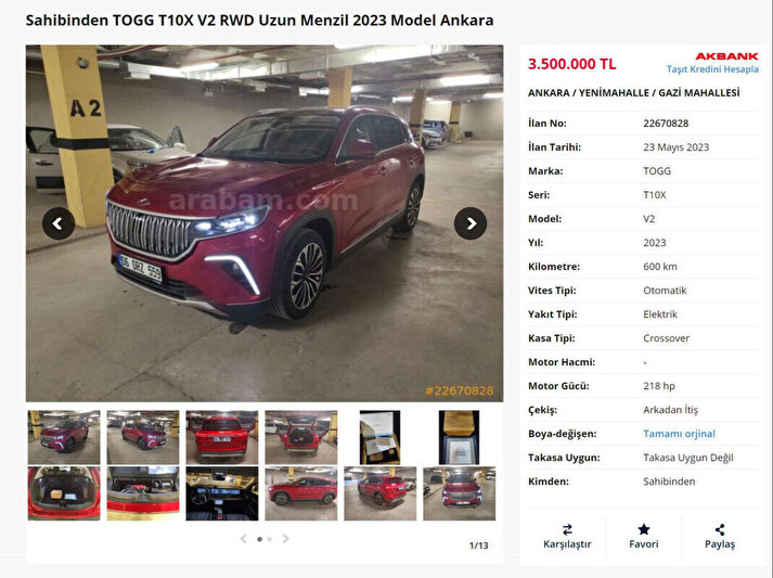 TOGG için ön siparişe başvuran ve otomobili almaya hak kazanan bir kişi, otomobilini satmak için ikinci el araba sitesine koydu. Standart satış fiyatı standart satış fiyatı ise 1 milyon 215 bin lira olan aracın, söz konusu ilanda Ankara’da satışa sunulduğu, henüz 600 km yol yaptığı ve 3.5 milyon liraya satışa konulduğu görüldü.