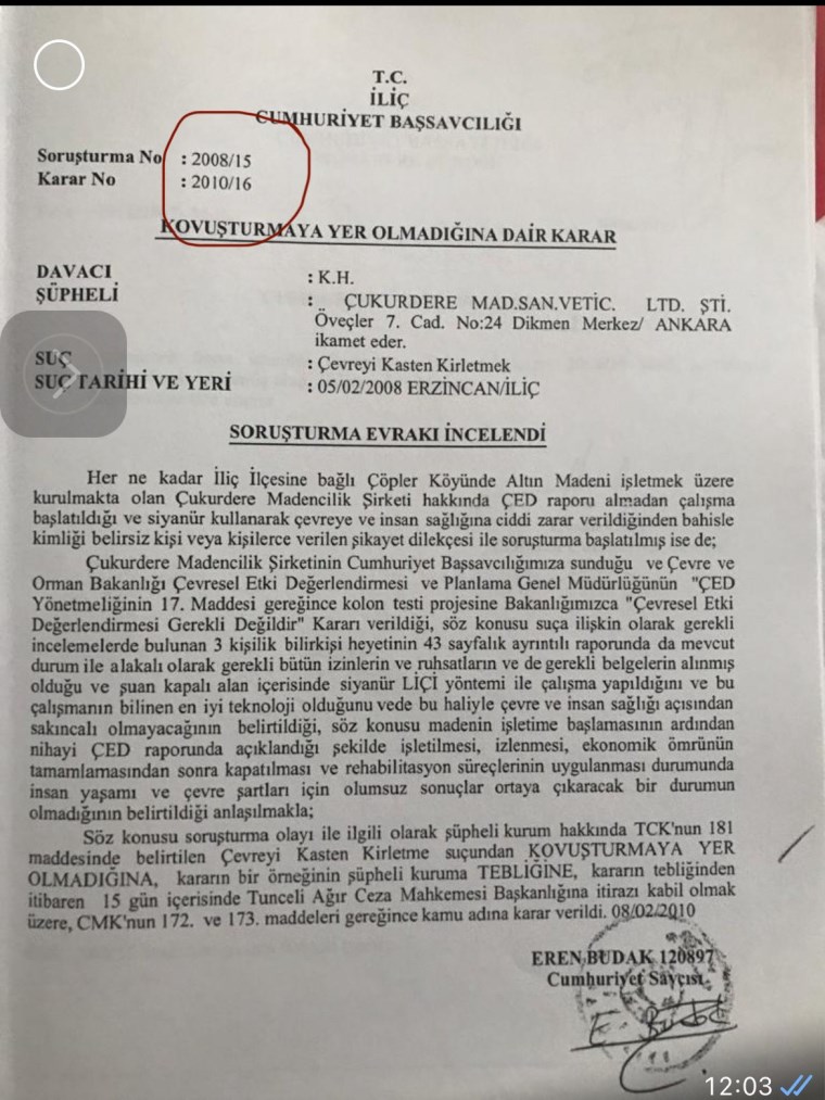 "Soruşturmayı kendisinin başlatmadığı" ve "altın aranmasında siyanür kullanılmadığı" iddialarına yanıt veren Cihaner, soruşturmaya ilişkin belgeleri paylaştı.