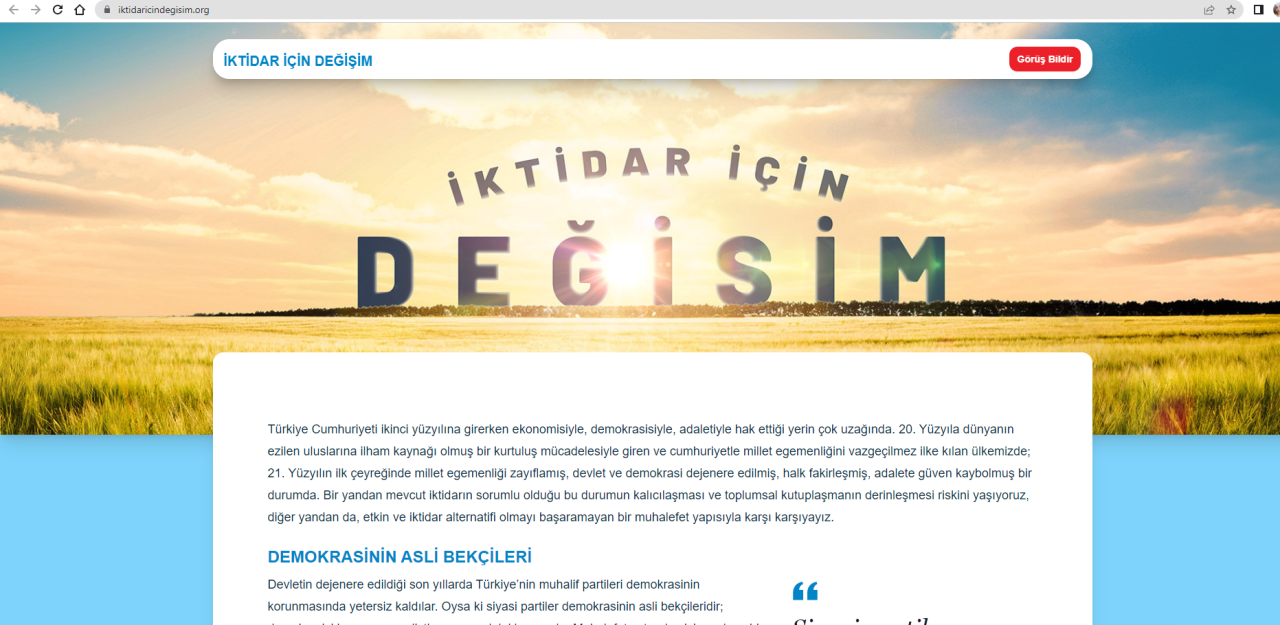 Değişerek iktidar olma, ülkemizi demokrasi ve uygarlık yolunda yukarıya taşıma hedefiyle çıktığımız bu yol, tüm vatandaşlarımızın katılımına açıktır. Bu topraklarda birlik ve beraberlik içinde kardeşçe yaşamak, özgür ve müreffeh bir toplum, adil bir paylaşım sistemi ve demokratik bir devlet isteyen her vatandaşımızı bizlerle iletişim kurmaya, aşağıdaki butonu tıklayarak ulaşılacak form üzerinden değişimle ilgili görüş ve önerilerini paylaşmaya davet ediyoruz."
