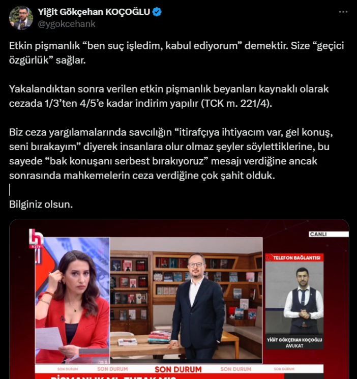 “Avukatım Yiğit Gökçehan Koçoğlu hakkında da gözaltı kararı olduğunu öğrendim. Şuan kendisi Adıyaman’da. 6 Şubat Depreminde İsias Otel’de evladını kaybeden 35 ailenin, mağdurun avukatlığını yapıyor. Yiğit, dün benim avukatımdı. Bugün depremde evladını kaybeden ailelerin avukatı.