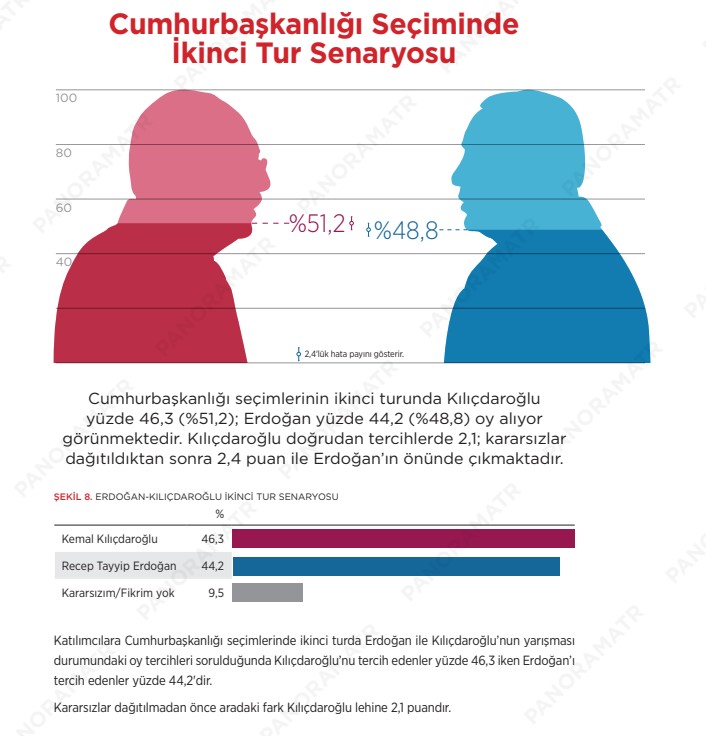 PanaromaTR Araştırma, Muharrem İnce'nin adaylıktan çekilmesinin ardından yeni bir anket paylaştı. İnce'ye oy verecek seçmenlerin tekrar aranarak "Oylarınızı kime vereceksiniz?" diye sorulan ankete göre Millet İttifakı Adayı Kemal Kılıçdaroğlu'nun yüzde 47,1 olan oyunun yüzde 47,9'a yükseldiği, Cumhurbaşkanı Recep Tayyip Erdoğan'ın ise yüzde 45,7 olan oyunun yüzde 46,6'ya yükseldiği ifade edildi. Bu sonuçlara göre ise seçim 2. tura kalıyor.