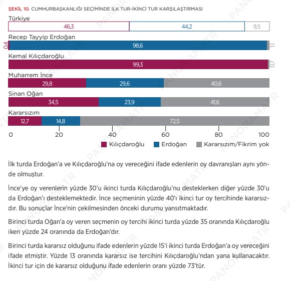 Anket sonuçlarına göre İnce'nin çekilmesinden önce ilk turda Muharrem İnce'ye oy verecek seçmenin yüzde 30'u ikinci turda Kılıçdaroğlu'na diğer yüzde 30'u da Erdoğan'a oy vereceğini açıkladı. Yüzde 40'lık diğer seçmen ise kararsız olduğunu bildirdi.
