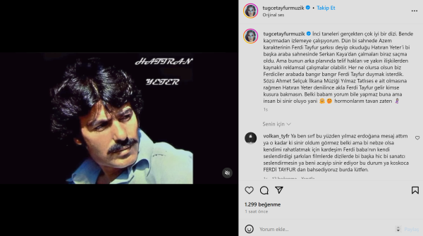 "İnci Taneleri gerçekten çok iyi bir dizi. Ben de kaçırmadan izlemeye çalışıyorum. Dün bir sahnede Azem karakterinin Ferdi Tayfur şarkısı deyip okuduğu Hatıran Yeter'i bir başka araba sahnesinde Serkan Kaya'dan çalmaları biraz saçma oldu."