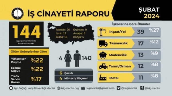 İSİG Meclisi’nin ulusal ve yerel basından, işçilerin mesai arkadaşları, aileleri, iş güvenliği uzmanları, işyeri hekimleri, sendikalar derlediği bilgilere dayanarak hazırladığı rapora göre, Şubat ayında en az 144, her gün en az beş işçi iş cinayetlerinde öldü.
