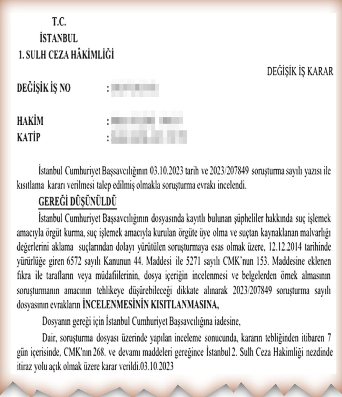 Aynı gün savcılık, 2023/207849 soruşturma yazısı ile kısıtlama getirilmesi için İstanbul 1. Sulh Ceza Hakimliğine başvurdu.