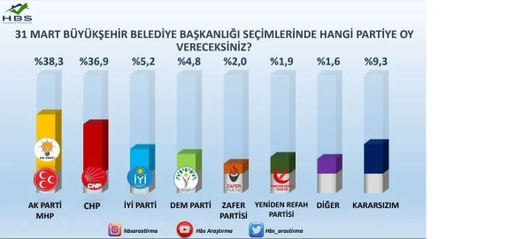 HBS Araştırma, İstanbul'da 2 bin 925 kişiyle yüz yüze görüşme metoduyla anket çalışması yaptı. Ankette, "31 Mart Büyükşehir Belediye Başkanlığı seçiminde hangi partiye oy vereceksiniz?" sorusu yöneltildi.
