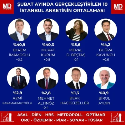 ASAL, DİEN, HBS, MetroPOLL, Optimar, ORC, Özdemir, PİAR, SONAR ve TÜSİAR'ın şubat ayı anketlerine göre, İstanbul'da yarışan adayların aldıkları oy yüzdesi belli oldu.
