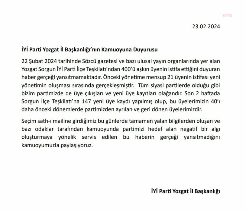 "22 Şubat 2024 tarihinde bazı ulusal yayın organlarında yer alan Yozgat Sorgun İYİ Parti İlçe Teşkilatı’ndan 400’ü aşkın üyenin istifa ettiğini duyuran haber gerçeği yansıtmamaktadır. Önceki yönetime mensup 21 üyenin istifası yeni yönetimin oluşması sırasında gerçekleşmiştir. Tüm siyasi partilerde olduğu gibi bizim partimizde de üye çıkışları ve yeni üye kayıtları olağandır. Son 2 haftada Sorgun İlçe Teşkilatı’na 147 yeni üye kaydı yapılmış olup, bu üyelerimizin 40’ı daha önceki dönemlerde partimizden ayrılan ve geri dönen üyelerimizdir. Seçim sath-ı mailine girdiğimiz bu günlerde tamamen yalan bilgilerden oluşan ve bazı odaklar tarafından kamuoyunda partimizi hedef alan negatif bir algı oluşturmaya yönelik servis edilen bu haberin gerçeği yansıtmadığını kamuoyumuzla paylaşıyoruz."