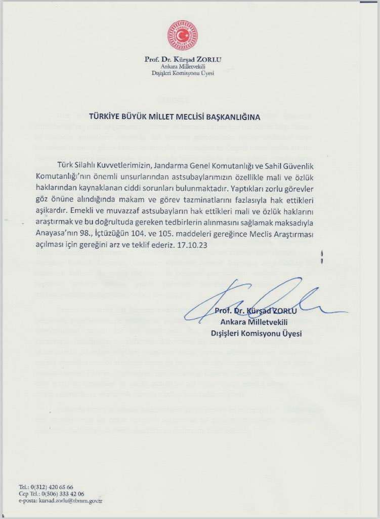 TBMM'ye Astsubayları için meclis araştırma önermesi veren Zorlu, Astsubayların yıllardır sorunlarının çözülemediğine dikkat çekti.