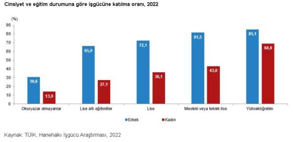 Okuryazar olmayan kadınların iş gücüne katılma oranı yüzde 13,9, lise altı eğitimli kadınların iş gücüne katılma oranı yüzde 27,1, lise mezunu kadınların iş gücüne katılma oranı yüzde 36,1, mesleki veya teknik lise mezunu kadınların iş gücüne katılma oranı yüzde 43 iken, yükseköğretim mezunu kadınların iş gücüne katılma oranı yüzde 68,8 oldu.