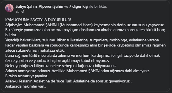 "Ağabeyim Muhammed Şahin’i (Muhammed Hoca) kaybetmenin derin üzüntüsünü yaşıyoruz. Bu süreçte yanımızda olan acımızı paylaşan dostlarımıza akrabalarımıza sonsuz teşekkürü borç bilirim.