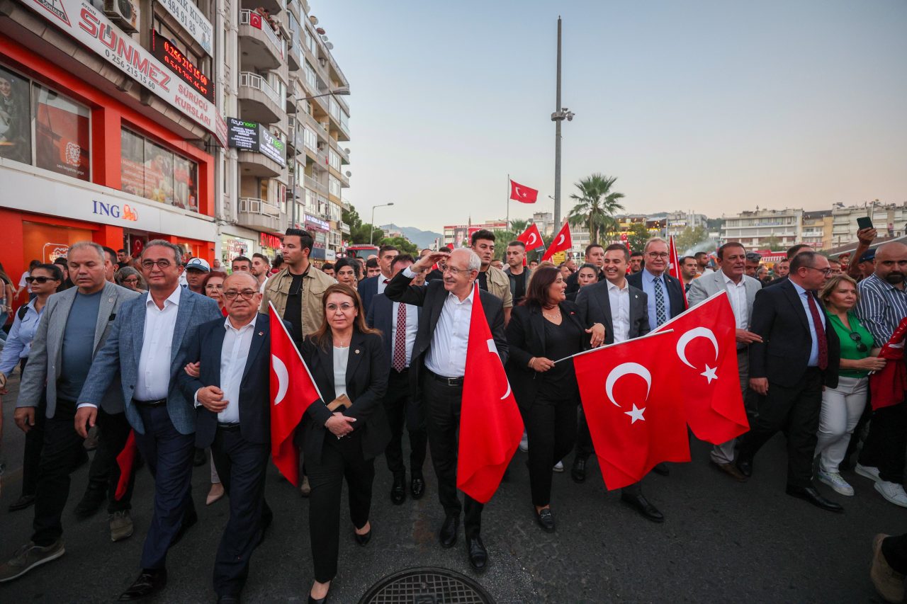 Kılıçdaroğlu, Aydın Büyükşehir Belediyesi binasından başlayıp Adnan Menderes Bulvarı boyunca devam eden fener alayı yürüyüşüne katıldı. Yürüyüşte Kılıçdaroğlu’na; TBMM Başkanvekili Gülizar Biçer Karaca, CHP Sözcüsü Faik Öztrak, CHP Genel Başkan Yardımcısı Ahmet Akın, CHP Aydın Milletvekilleri Bülent Tezcan, Hüseyin Yıldız ve Süleyman Bülbül ile Aydın Büyükşehir Belediye Başkanı Özlem Çerçioğlu, ilçe belediye başkanları ve parti yöneticileri eşlik etti.