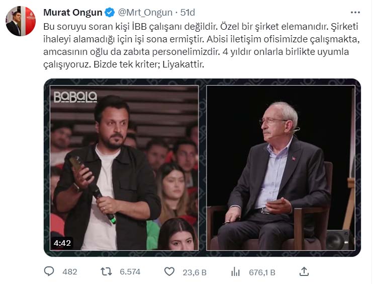 Millet İttifakı ve Cumhuriyet Halk Partisi (CHP) Genel Başkanı Kemal Kılıçdaroğlu, YouTube kanalı BaBaLa TV'de Oğuzhan Uğur'un moderatörlüğünü yaptığı "Mevzular Açık Mikrofon" programına katıldı ve karşıt görüşlü gençlerin sorularını yanıtladı. Programda, Ekrem İmamoğlu Başkan olduktan sonra İstanbul Büyükşehir Belediyesi'nden (İBB) atıldığını iddia eden kişinin, İBB'nin sürekli çalışanı olmadığı öğrenildi. Aynı zamanda daha önce AKP teşkilatlarında bulunmadığını söyleyen bir başka kişinin de İçişleri Bakanı Süleyman Soylu'yla fotoğrafları ortaya çıktı.