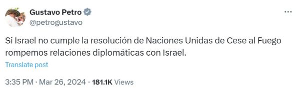 Kolombiya Devlet Başkanı Petro, kararın Birleşmiş Milletler Güvenlik Konseyi’nde görüşülüp kabul edilmesini takiben İsrail’in ateşkesi bozması halinde ‘ülkeleri İsrail’le diplomatik ilişkilerini kesmeye’ çağırmıştı.