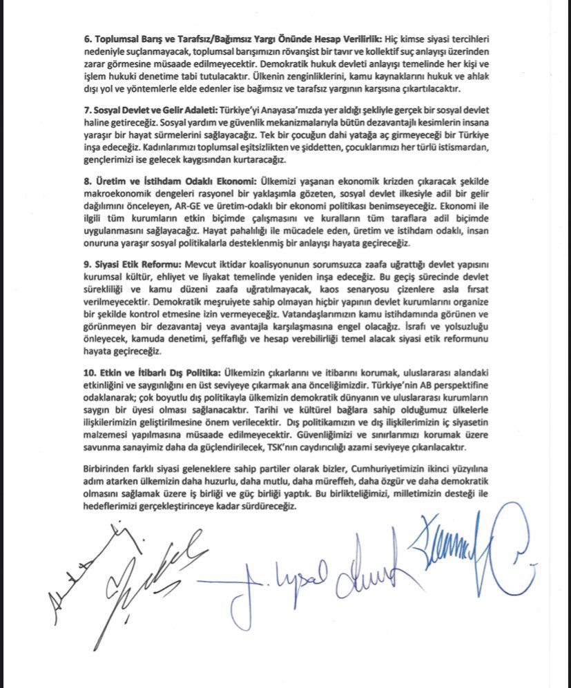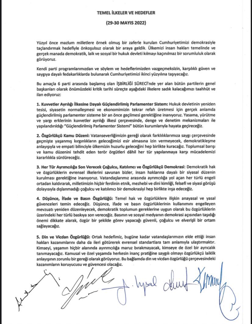Liderler dördüncü buluşmada “Temel İlkeler ve Hedefler” başlığıyla yayınlanan 10 maddenin altına imza attı. Açıklamada 10 madde için “Bugün açıkladığımız “Temel İlkeler ve Hedefler” metniyle geçiş süreci ve ülke yönetimi konusunda bundan sonraki ortak çalışmalarımıza referans kaynağı olacak bir tutum belgesi ortaya koymuş bulunuyoruz. Bu referans metin aynı zamanda milletimize ve partilerimizin tabanlarına ortak bir taahhüt niteliği taşımaktadır” ifadeleri kullanıldı.