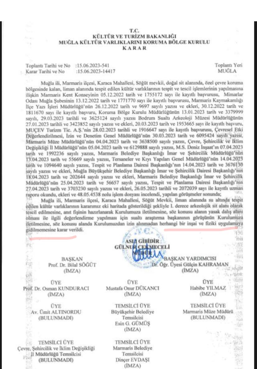 Bildiğiniz gibi MUÇEV Marina büyütme projesi için ÇED olumlu kararı verilmiş ve bu kararın iptali için dava açmıştık. Dava devam ederken koy içerisinde yer alan tarihi eserler nedeniyle Anıtlar Kurulu proje alanının bir bölümünü de kapsayacak şekilde koyu 1. derece arkeolojik sit alanı olarak tescil etti.
