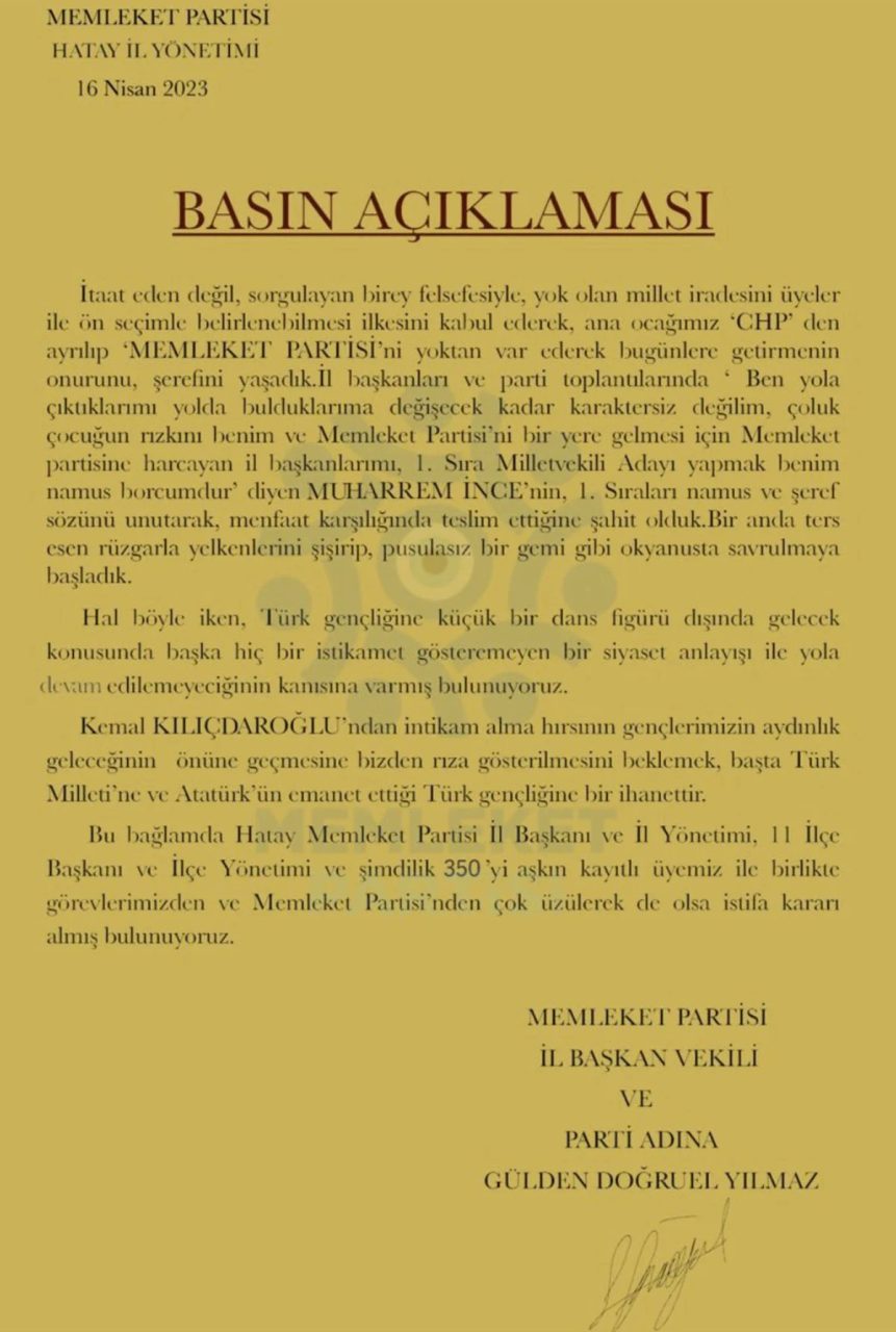 Hatay'da 11 ilçe başkanının istifa etmesinin ardından Memleket Partisi Hatay İl Başkanı Gülden Doğruel Yılmaz da istifa etti. Yılmaz, "Muharrem İnce'nin, verdiği namus ve şeref sözlerini unutup 1. sıraları menfaat karşılığında teslim ettiğine şahit olduk. Kemal Kılıçdaroğlu'ndan intikam alma hırsının, gençlerimizin aydınlık geleceğinin önüne geçmesine rıza göstermemizi beklemek, Türk milletine Türk gençliğine ihanettir" dedi.