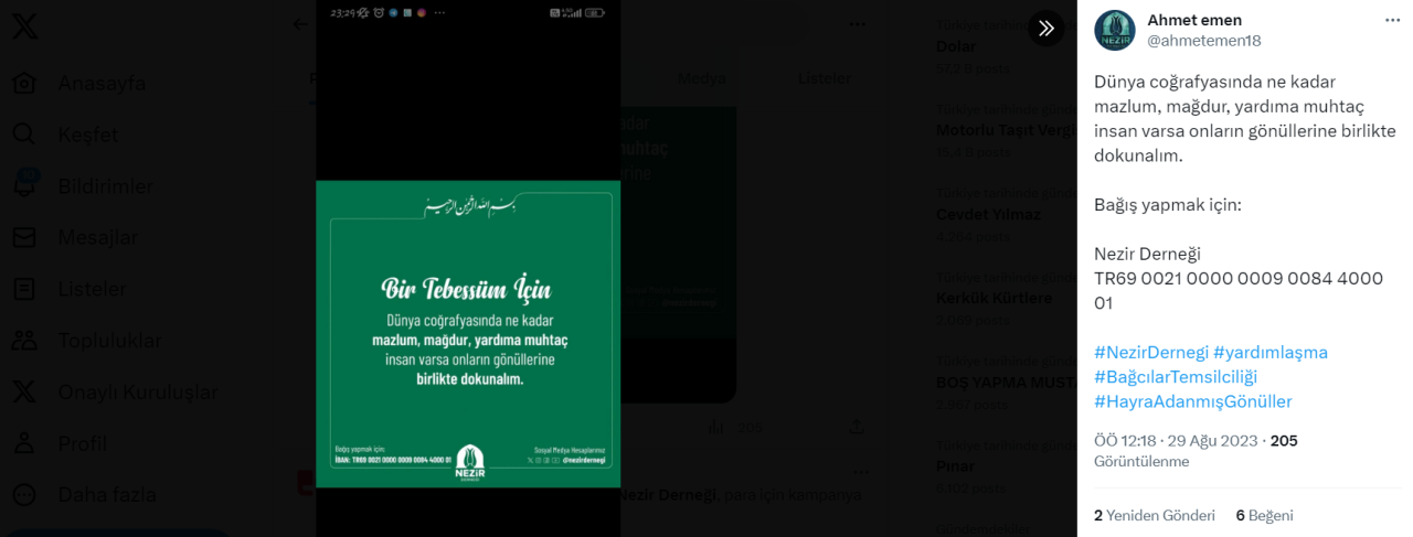 Tarikat üyeleri, henüz iki hafta kadar önce faaliyetlere başlandığını açıklayan Nezir Derneği’ne ait olduğunu belirttikleri IBAN adresini sosyal medyada paylaşarak bağış yapma çağrısında bulunuyor.