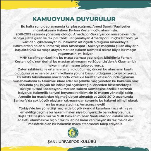 Geçtiğimiz hafta çarşamba günü, rutin olarak, MHK yapay zekâ ile dijital ortamda hakem atamalarını yaptı. Yapay zekâ, İkinci Lig Beyaz Grupta, lider Şanlıurfaspor’un, deplasmanda Amed Sportif Faaliyetler ile oynayacağı maçın hakemini, Ferhan Kestanlıoğlu olarak belirledi. Çarşı bu atamanın ilanı sonrası karıştı. Şanlıurfaspor, hakem atamasına itiraz ederek, sosyal medya hesabından “Kamuoyuna Duyurulur” başlığı altında, adeta MHK’ya muhtıra verircesine bir bildiri yayınladı. Bildiride; ”2018-2019 sezonunda yönetmiş olduğu Amedspor-Sakarya müsabakasında sahaya jiletle giren ve rakip futbolcuları yaralayan Amedsporlu hiçbir futbolcuya kart dahi çıkarmayan bu hakemin art niyetli olduğunu bilmekteyiz.” denilerek, “Ferhan Kestanlıoğlu’nun derhal bu maçtan alınmasını talep “ettiklerini deklare ettiler.