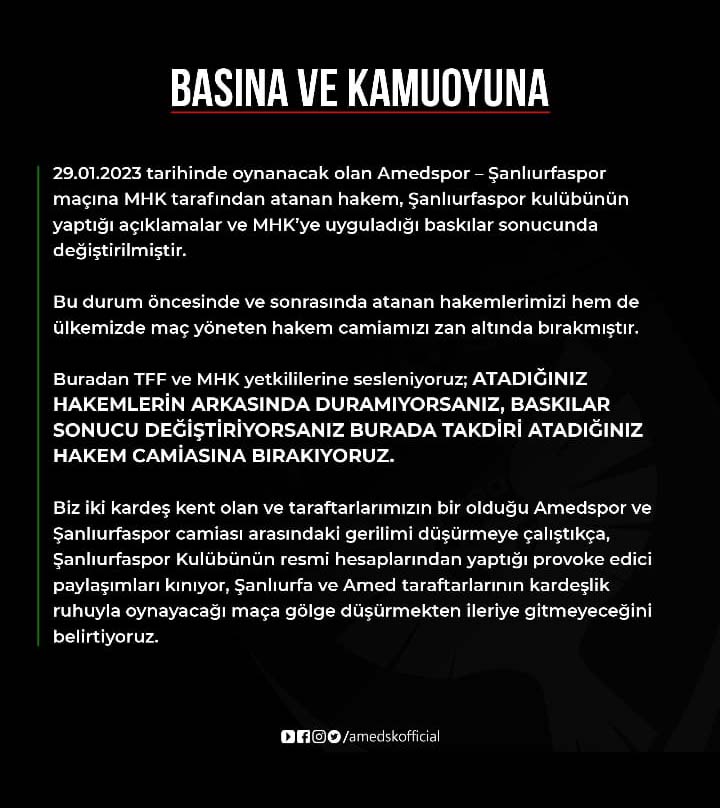 Amedspor da MHK tarafından yapılan hakem değişikliği sonrasında, sosyal medya üzerinden bir açıklama yayınladı. Açıklamada Amedspor, MHK’nın atadığı hakemlerin arkasında duramadığını ifade etti. Amed Sportif Faaliyetler Başkanı Sayın Selahattin Yıldırım ile telefonda konuştum. Selahattin Başkan; yapılan bu yanlış uygulama ile tüm kulüpler için yolun açıldığını belirterek, “bundan sonra ben de istemediğim hakem olursa MHK’ya baskı yaparak değiştireceğim.” dedi.