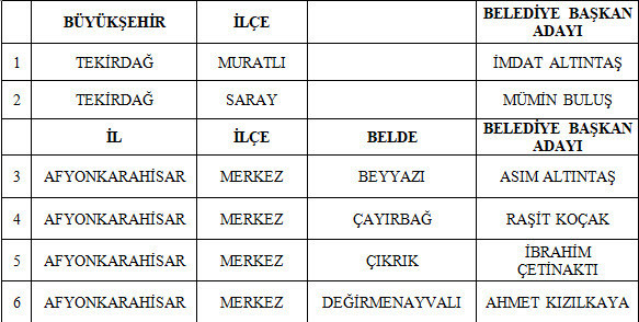 MHP'den yapılan açıklamada, "Partimizin yetkili kurullarının yapmış olduğu değerlendirme ve Genel Başkanımız Sayın Devlet Bahçeli'nin onayları sonucunda 31 Mart 2024 Mahalli İdareler Seçimlerinde 10. etap olarak adaylıkları kesinleşen 2 Büyükşehir İlçe, 53 Belde Belediye Başkan Adayımız olmak üzere toplam 55 adayımızın isim listesi aşağıdadır" ifadeleri yer aldı