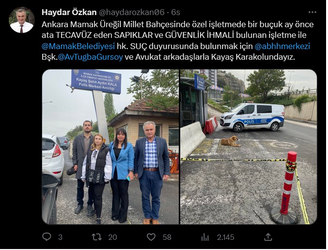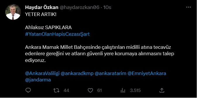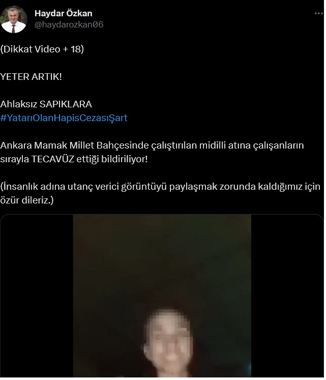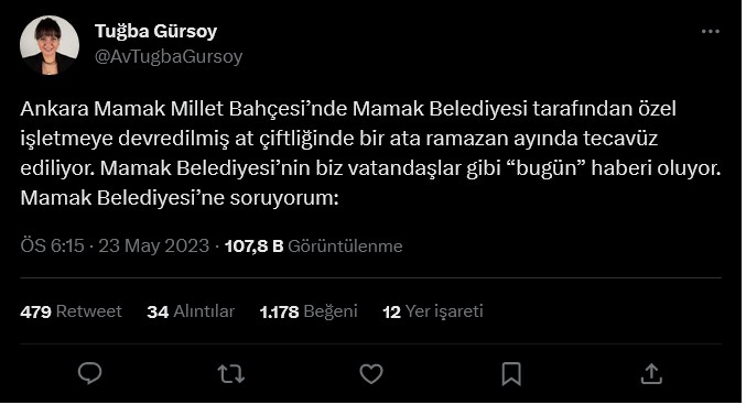 “Ankara Mamak Millet Bahçesi’nde Mamak Belediyesi tarafından özel işletmeye devredilmiş at çiftliğinde bir ata ramazan ayında tecavüz ediliyor. Mamak Belediyesi’nin biz vatandaşlar gibi “bugün” haberi oluyor. Mamak Belediyesi’ne soruyorum: