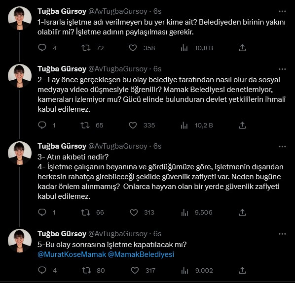 Tuğba Gürsoy da atın tecavüze uğradığı işletmenin ısrarla isminin verilmediğini belirterek, “Bu yer kime ait? Belediyeden birinin yakını olabilir mi?” sorusunu yöneltti.