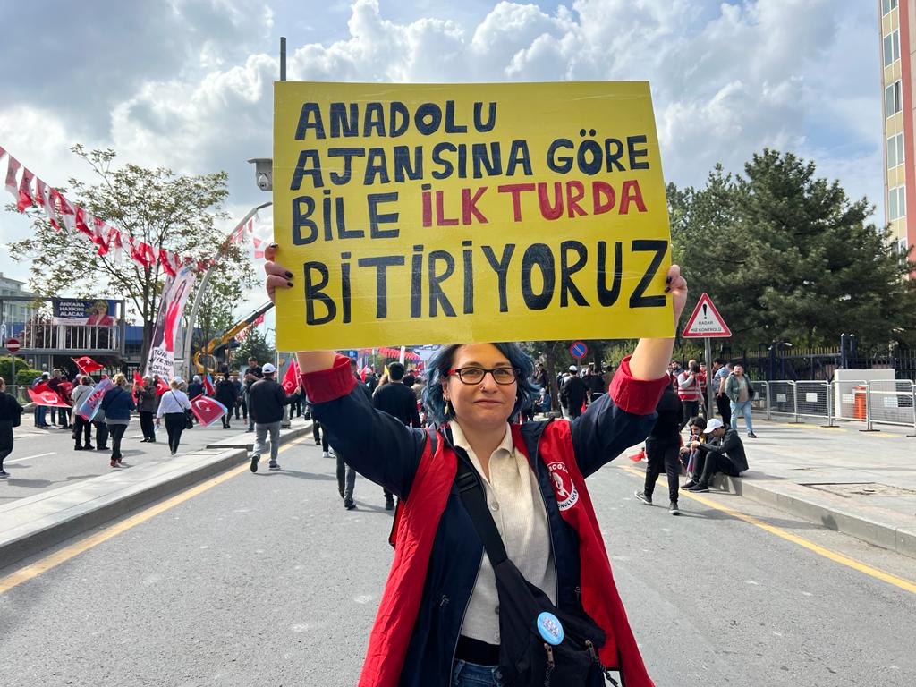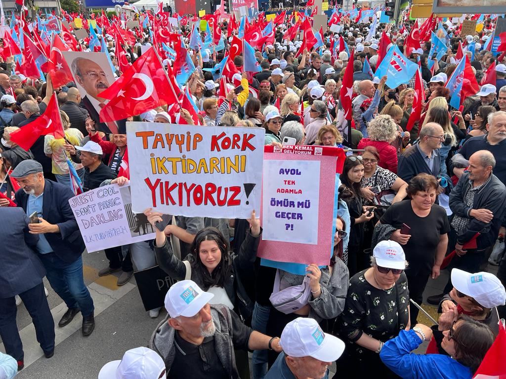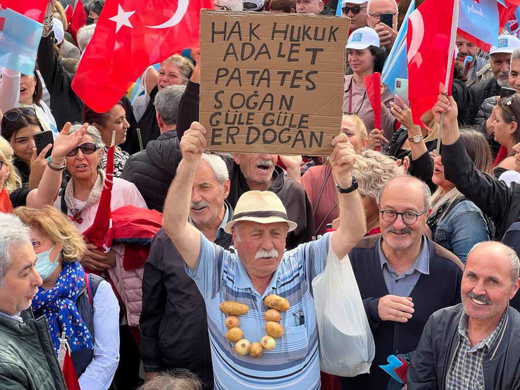 “Domates, biber patlıcan bu seçim saplican”, “Hak, hukuk, adalet, patates soğan güle güle Erdoğan”, “Tayyip kork iktidarını yıkıyoruz”, “Sarayı boşalt biz geliyoruz”, “Anadolu Ajansı’na göre bile ilk turda bitiriyoruz” gibi dövizler öne çıkan dövizlerdi.
