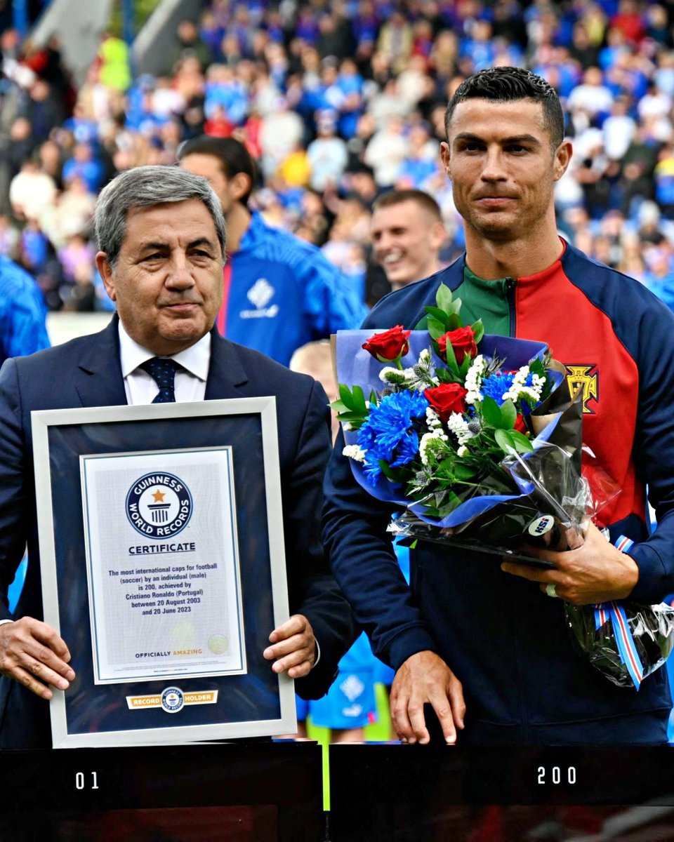 Cristiano Ronaldo, Portekiz milli takımı formasını 200. giydi. Futbol tarihinin en fazla milli maçına çıkan ve en çok gol atan ismi olan 38 yaşındaki yıldız futbolcu, bu sayıyla adını Guiness Rekorlar Kitabı'na yazdırdı.