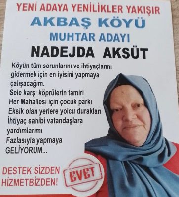 Moldova'dan 12 yıl önce Bartın’ın Akbaş köyüne gelin gelen Nadejda Aksüt (57), muhtar adayı oldu. Köyde 200 haneyi tek tek gezerek, destek isteyen Aksüt, “Bana, ‘Neredeydin bu zamana kadar, şimdiye kadar neden çıkmadın?’ diyorlar. Bana çok güveniyorlar. Başarılı olacağıma inanıyorum” dedi.