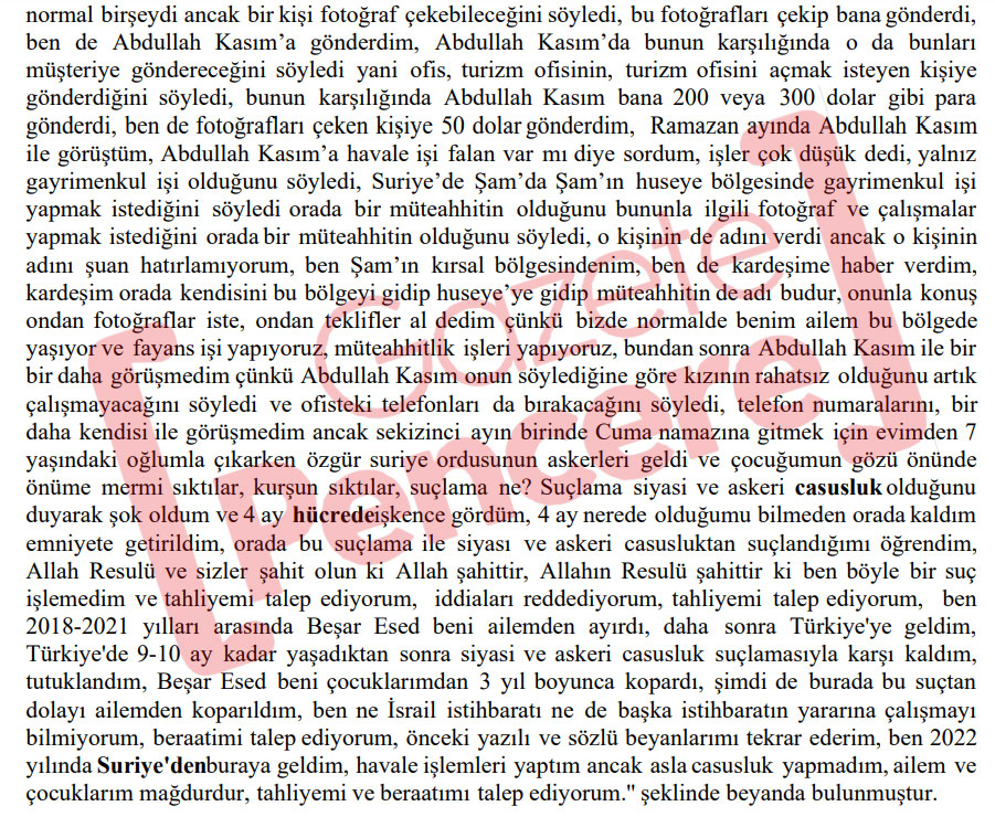 “Abdullah Kasım (MOSSAD ajanı) onun söylediğine göre kızının rahatsız olduğunu artık çalışmayacağını söyledi ve ofisteki telefonları da bırakacağını söyledi, bir daha kendisi ile görüşmedim. Sekizinci ayın birinde Cuma namazına gitmek için evimden 7 yaşındaki oğlumla çıkarken Özgür Suriye Ordusu’nun askerleri geldi ve çocuğumun gözü önünde önüme mermi sıktılar, kurşun sıktılar. Suçlama ne? Suçlama siyasi ve askeri casusluk olduğunu duyarak şok oldum ve 4 ay hücrede işkence gördüm. 4 ay nerede olduğumu bilmeden orada kaldım Emniyet’e getirildim. Orada bu suçlama ile siyasi ve askeri casusluktan suçlandığımı öğrendim. Allah Resulü ve sizler şahit olun ki Allah şahittir, Allahın Resulü şahittir ki ben böyle bir suç işlemedim. Ben 2018-2021 yılları arasında Beşar Esed beni ailemden ayırdı, daha sonra Türkiye'ye geldim, Türkiye'de 9-10 ay kadar yaşadıktan sonra siyasi ve askeri casusluk suçlamasıyla karşı kaldım, tutuklandım. Beşar Esed beni çocuklarımdan 3 yıl boyunca kopardı, şimdi de burada bu suçtan dolayı ailemden koparıldım. Ben ne İsrail istihbaratı ne de başka istihbaratın yararına çalışmayı bilmiyorum.”