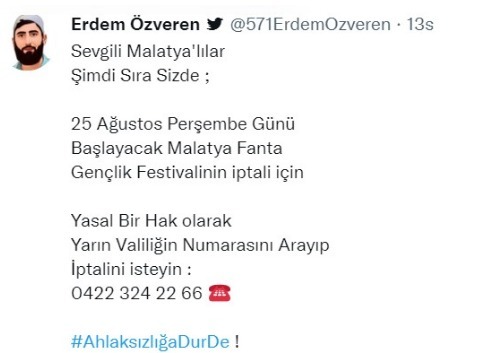 Özveren, yaptığı paylaşımla şu çağrıda bulundu: “Sevgili Malatyalılar şimdi sıra sizde 25 Ağustos Perşembe Günü Başlayacak Malatya Fanta Gençlik Festivali’nin iptali için yasal bir hak olarak yarın valiliğin numarasını arayıp iptalini isteyin.”