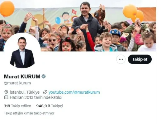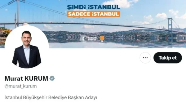 Cumhur İttifakı'nın İstanbul adayı Murat Kurum, sosyal medya platformu 'X' hesabındaki profil kısmını güncelledi. Seçimden önce yazan "İstanbul Büyükşehir Belediye Başkan Adayı" yazısını kaldırdı.