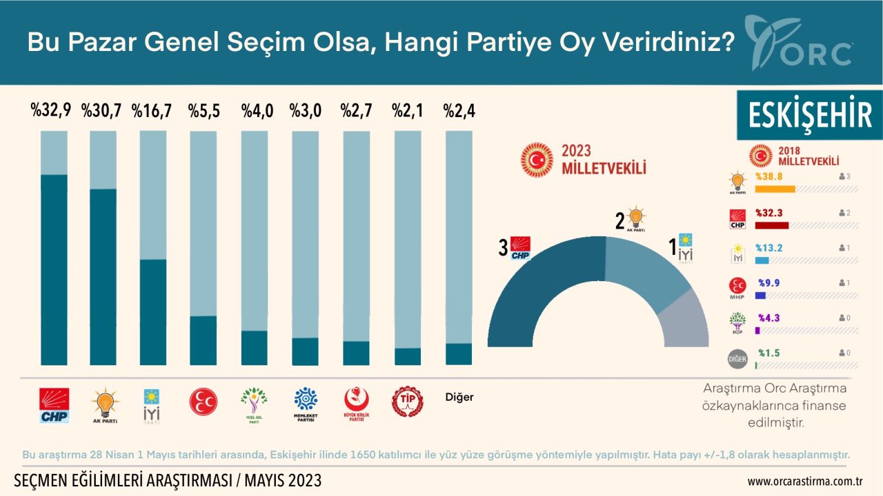 28 Nisan-1 Mayıs tarihleri arasında gerçekleştirilen ankete göre; Eskişehir'de milletvekili seçimlerinde oy oranları şöyle: