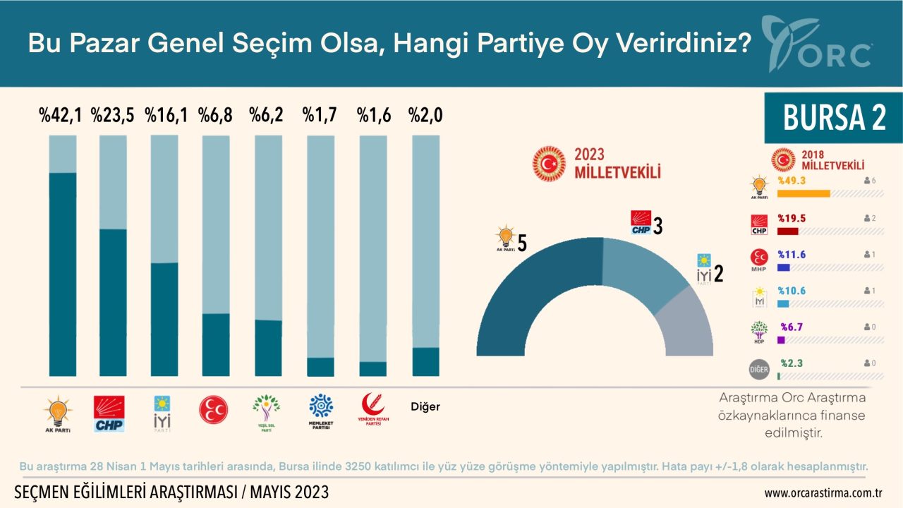 ORC Araştırma, Bursa ve Eskişehir’de gerçekleştirdiği genel seçim anketinin sonuçlarını yayımladı. Söz konusu illerde partilerin oy oranları üzerinden kaç milletvekili çıkaracağı hesaplandı. Bu rakamlar 2018 seçim sonuçlarıyla karşılaştırıldı.