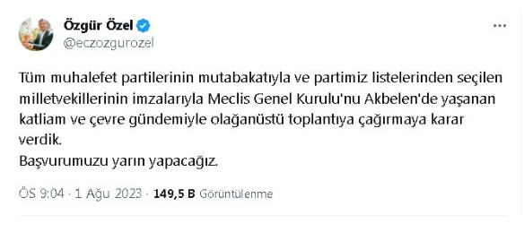 CHP Grup Başkanı Özgür Özel, Akbelen ormanları ile ilgili Türkiye Büyük Millet Meclisini (TBMM) olağanüstü toplantıya çağıracaklarını belirtti. Özel, gelişmeyi sosyal medyadan duyurdu.