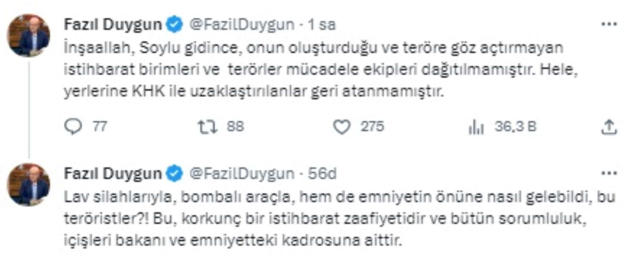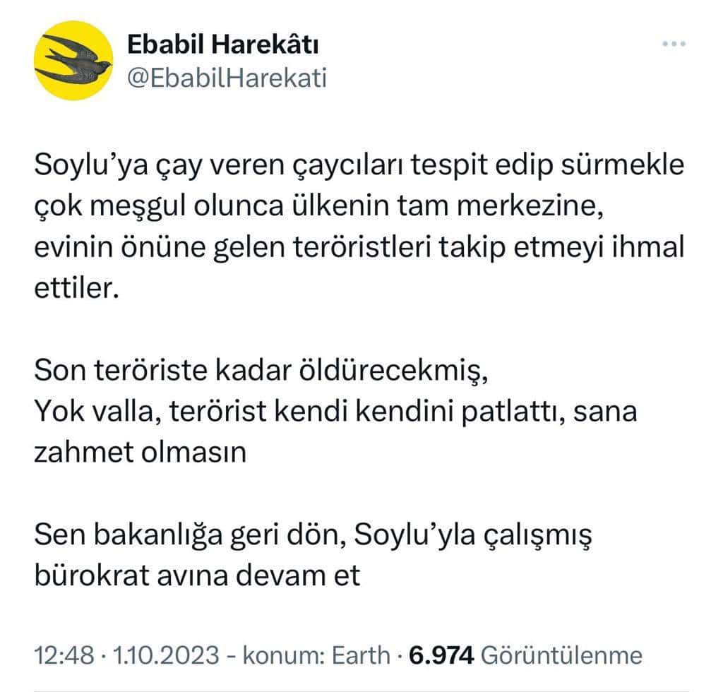 Soylu’nun ardından İçişleri Bakanlığı görevine getirilen İçişleri Bakanı Ali Yerlikaya’nın bakanlıkta ve emniyette yaptığı görev değişikliklerine vurgu yapılan tweette “Soylu’ya çay veren çaycıları tespit edip sürmekle çok meşgul olunca, ülkenin tam merkezine, evinin önüne gelen teröristleri takip etmeyi ihmal ettiler. Son teröriste kadar öldürecekmiş… Yok valla, terörist kendi kendini patlattı. Sana zahmet olmasın. Sen bakanlığa geri dön. Soylu’yla çalışmış bürokrat avına devam et” denildi.