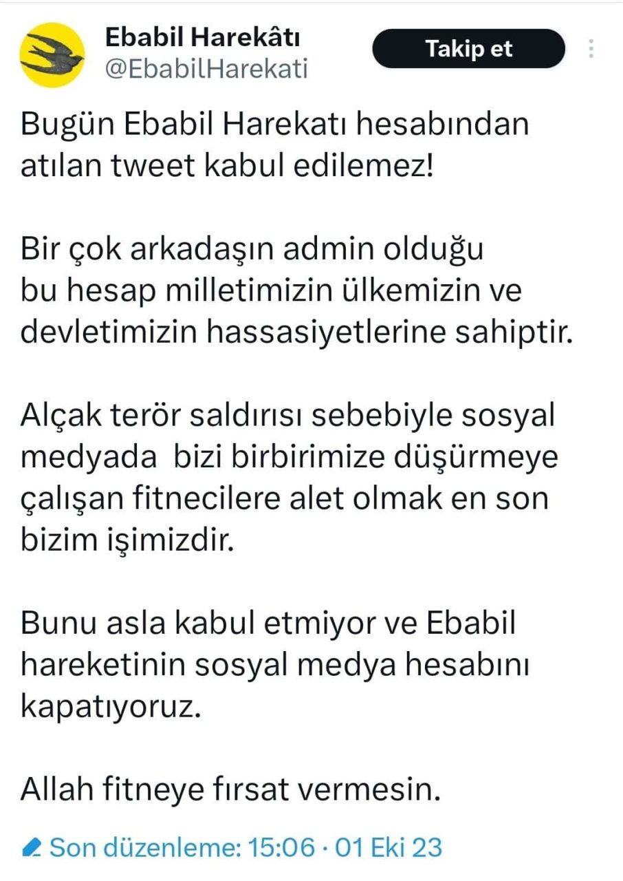 Bu paylaşımlar bir süre sonra silindi ve yeni bir tweet atılarak hesabın kapatılacağı açıklandı. Yapılan yeni paylaşımda, “Bugün Ebabil Harekatı hesabından atılan tweet kabul edilemez! Bunu asla kabul etmiyor ve Ebabil Harekatı’nın sosyal medya hesabını kapatıyoruz" ifadelerine yer verildi.