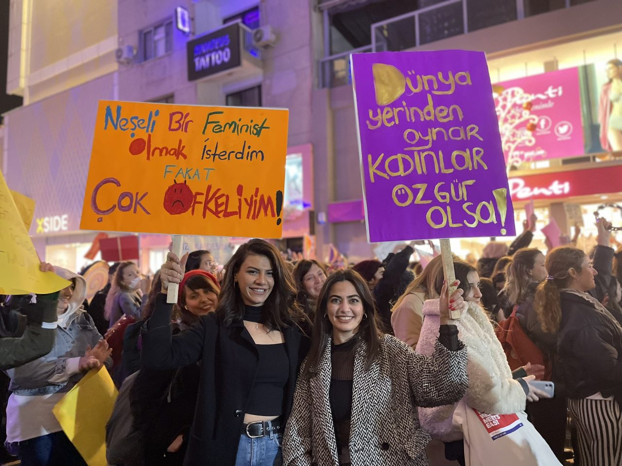 Sakarya Caddesi’nde yapılan açıklamada kadınlar, “Kadınların aynı haklara sahip olması için değil, bunun için buluşmadık. Biz, bugün burada toplanan feministler olarak, bütün dünyada bugün toplanan feministler olarak; çok daha büyük bir şey hedefliyoruz. Biz istiyoruz ki savaşın, sömürünün, işgalin, ırkçılığın, homofobinin, transfobinin, erkek şiddetinin olmadığı eşit, özgür bir dünyada yaşayalım. İsyanımız feministtir” dedi.