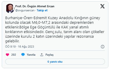 Ercan, Twitter hesabından yaptığı açıklamada, "Burhaniye-Ören-Edremit Kuzey Anadolu Kırığının güney kolunda olacak M6,0-M7,2 arasındaki depremlerden etkilenir. Bölge Ege Göçüntülü ile KAK yanal atımlı kırıklarının etkisindedir. Genç, sulu, tarım alanı olan çökeller üzerinde kurulu 2 katın üzerindeki yapılar rezonansa gelebilir" ifadelerini kullandı.