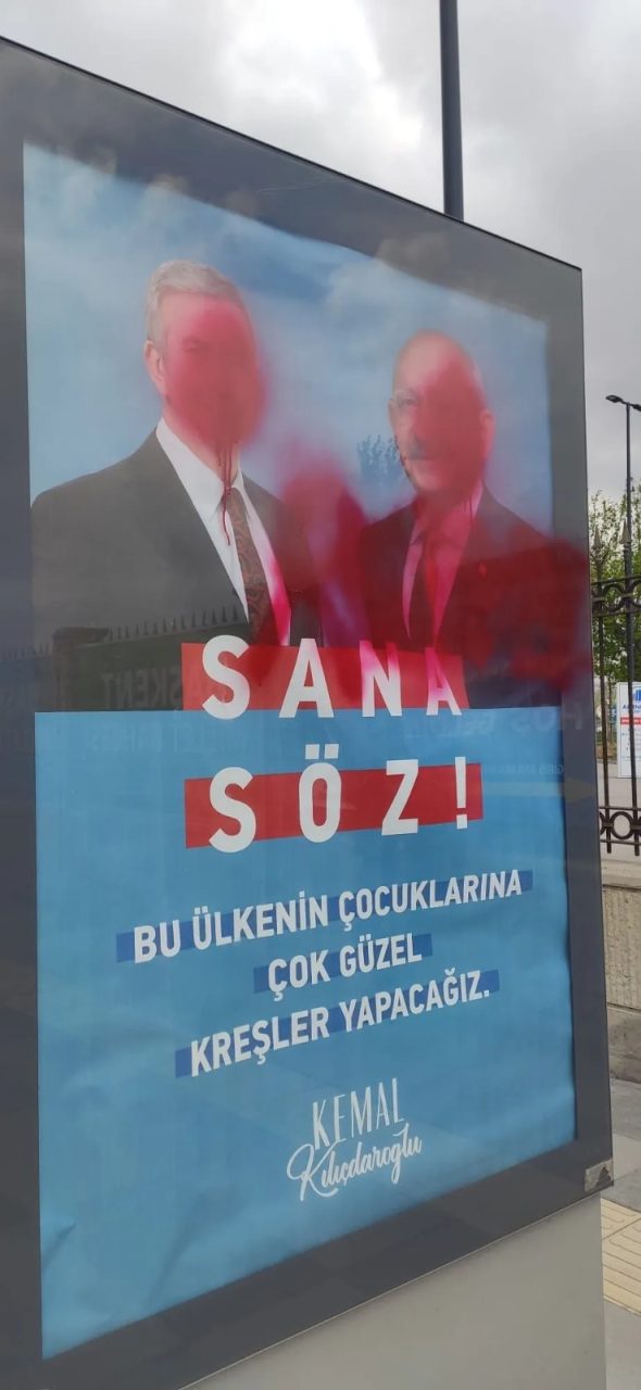 AK Parti’nin Ankara mitinginin yapılacağı Millet Bahçesi çevresinde bulunan CHP ve İYİ Parti afişleri kimliği belirsiz kişilerce söküldü ve boyandı. Erdoğan'ın 3 Mayıs'ta miting yapacağı Rize'de ise CHP'nin afişleri söküldü.