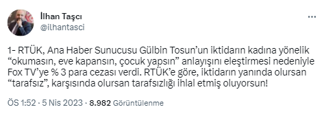 RTÜK, Ana Haber Sunucusu Gülbin Tosun’un iktidarın kadına yönelik “okumasın, eve kapansın, çocuk yapsın” anlayışını eleştirmesi nedeniyle Fox TV’ye % 3 para cezası verdi. RTÜK’e göre, iktidarın yanında olursan “tarafsız”, karşısında olursan tarafsızlığı ihlal etmiş oluyorsun!