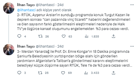 RTÜK, Ayşenur Arslan’ın sunduğu programda konuk Turgut Kazan ile deprem sonrası “can pazarında vinç ticareti” haberini değerlendirmeleri ve ölen sayısının farklı gösterilmesini eleştirmeleri nedeniyle de Halk TV’ye özgürce kanaat oluşumunu engellemekten %3 para cezası verdi.